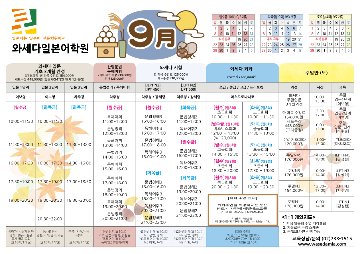 9¿ù ½Ã°£Ç¥ (9¿ù 2ÀÏ ¿ù¿äÀÏ °³°) °ü¸®ÀÚ ¦¢ 2024-08-14 HIT 1246 |
